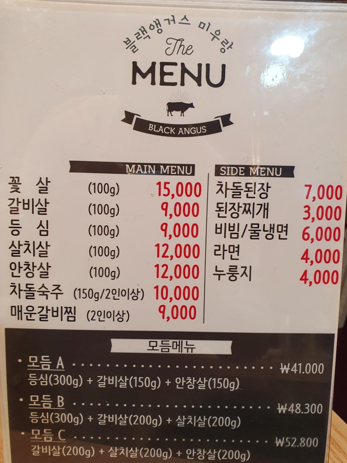 블랙앵거스 메뉴판이에요