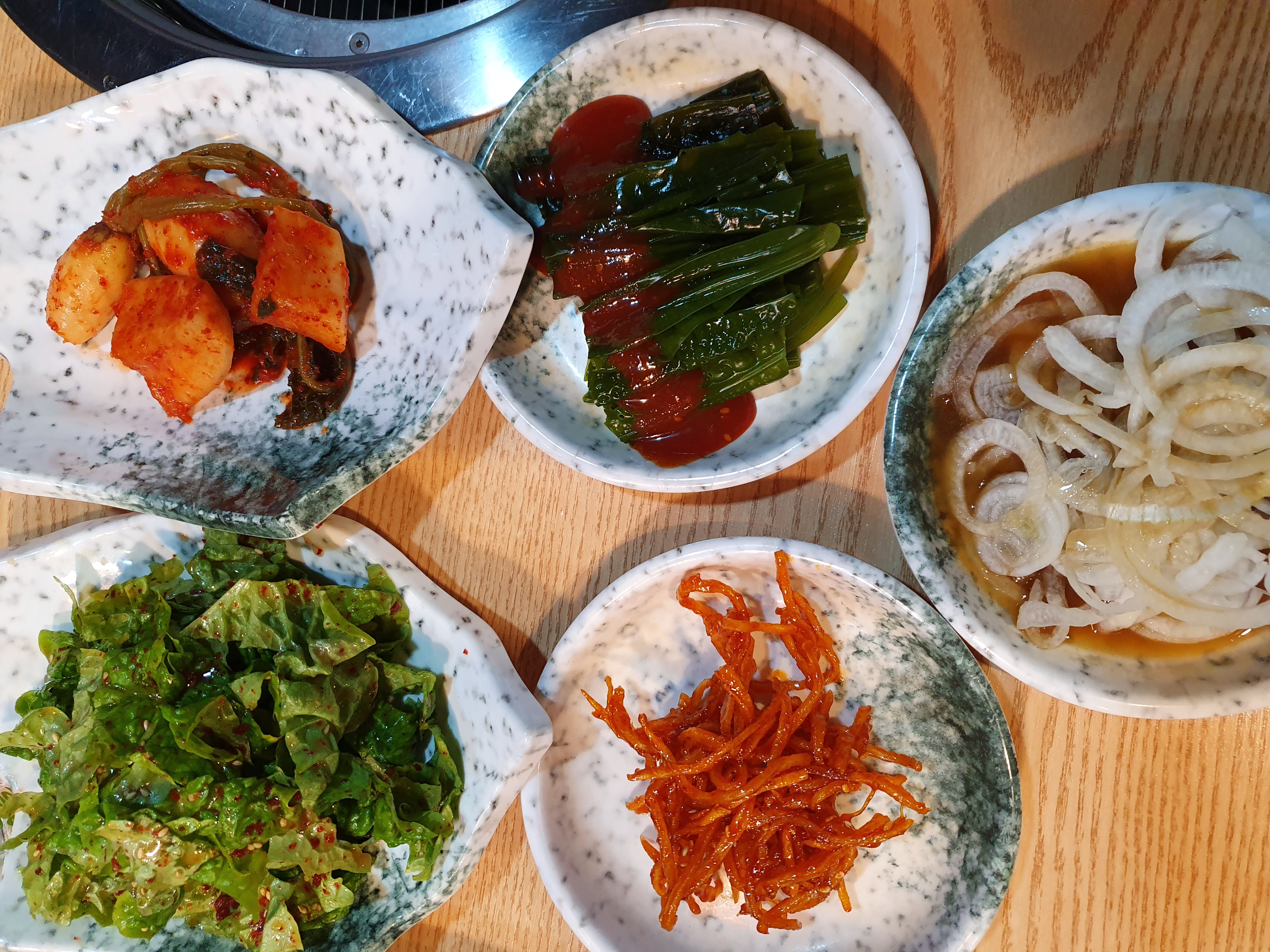 상추무침과 미역 , 총각김치 ,진미채무침 ,양파절임 등