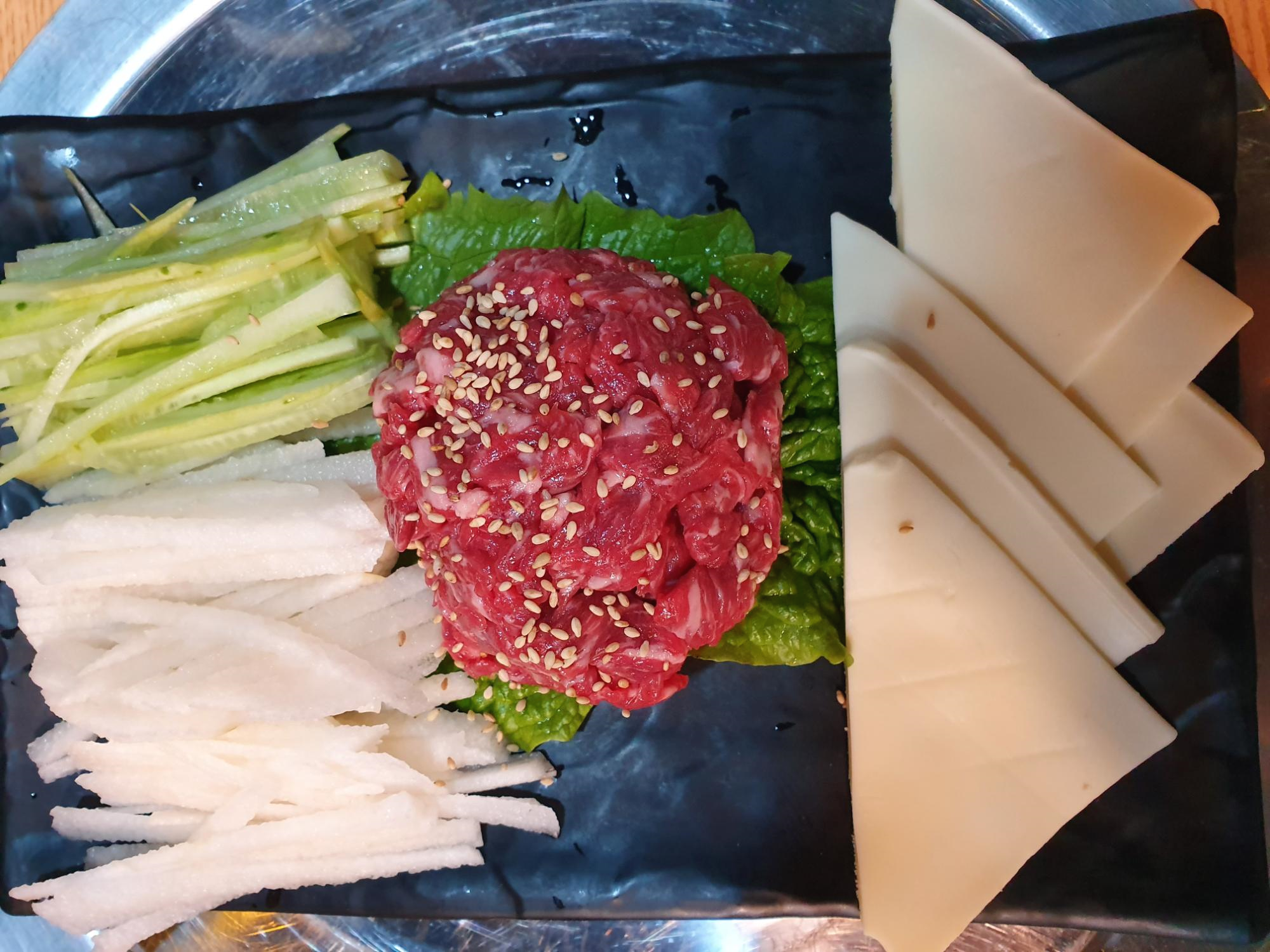 미우랑의 육회는 임실치즈와 같이 나오는데